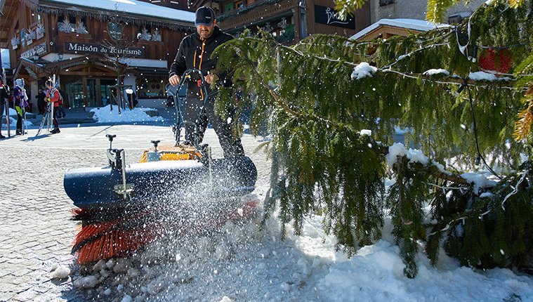 La balayeuse à batterie sans fil PELLENC professionnelle CLEANION déblaie aussi parfaitement la neige pendant les périodes hivernales.