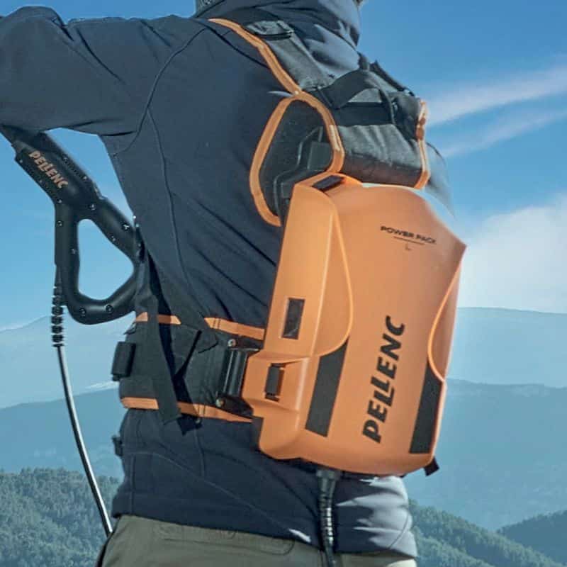Découvrez la batterie fournie avec son chargeur et son harnais dorsale pour utiliser confortablement pendant une journée entière votre secoueur d’olive.