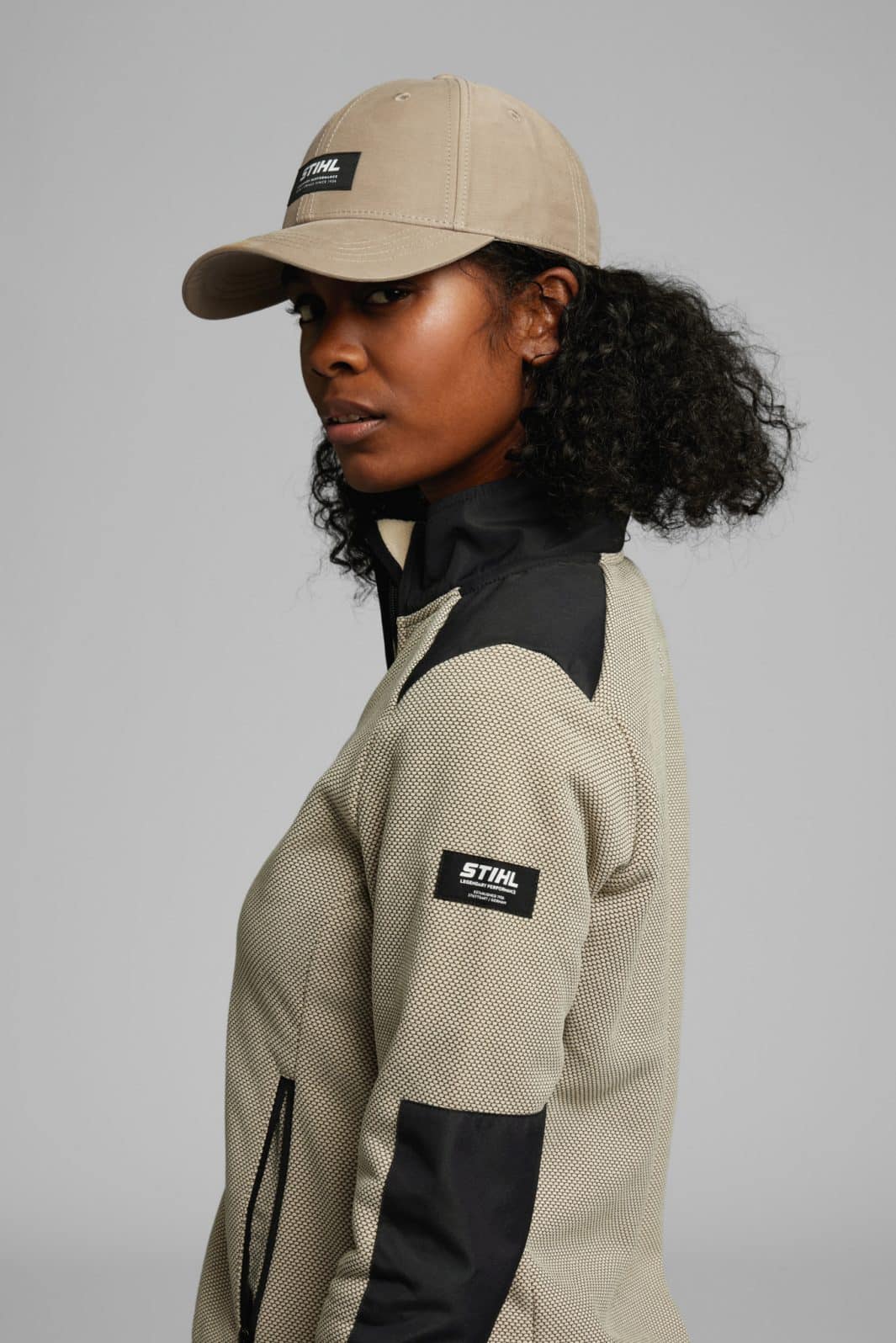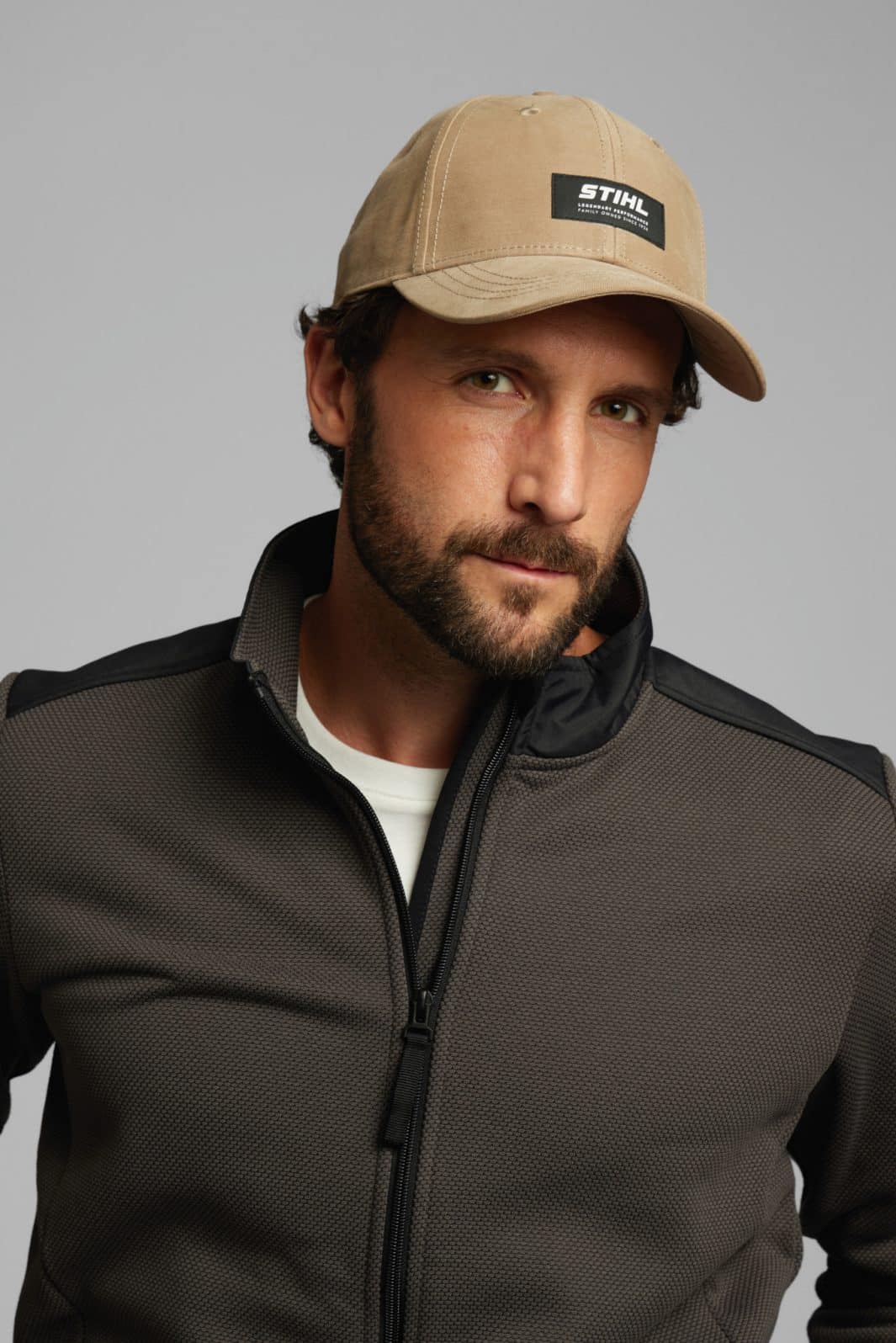 Casquette STIHL beige en mélange coton et Lyocell, une matière durable issue de fibres de bois, offrant confort et respirabilité. Son système de fermeture réglable à l’arrière permet un ajustement facile et précis. Elle est ornée d’une étiquette avec le logo STIHL et la mention « LEGENDARY PERFORMANCE » sur le devant.