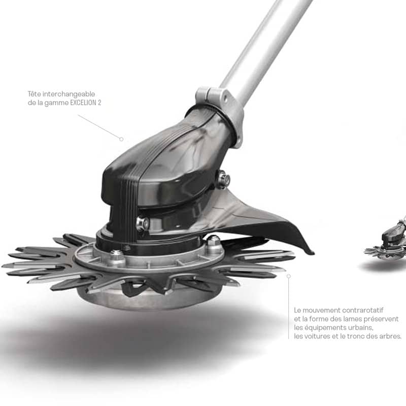 La tête de coupe pour débroussailleuses PELLENC CITY CUT, a été conçu avec des lames contrarotatives, fait pour limiter les projections, comme le gravier, et peut être utilisée en toute sûreté, en milieu urbain.