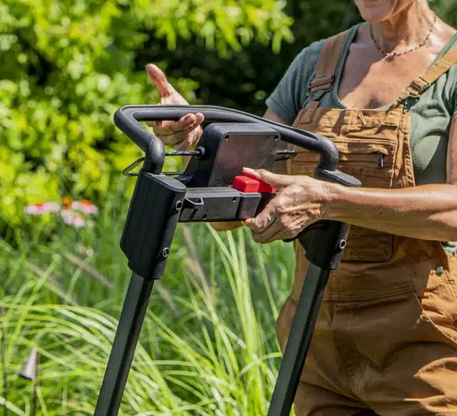 Un seul bouton est nécessaire pour plier la tondeuse, ce qui facilite son stockage. Le rangement de la tondeuse est aussi facilité par la possibilité de régler le guidon. C’est l’appareil idéal si vous disposez d’un petit espace de stockage.